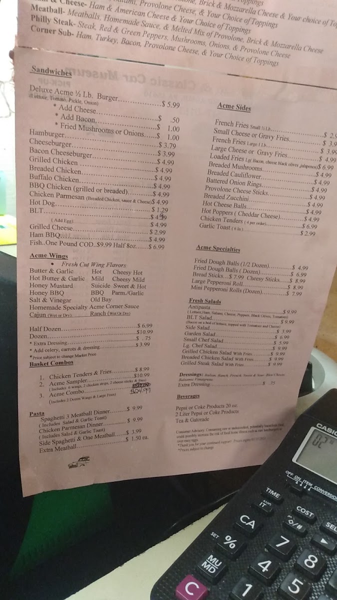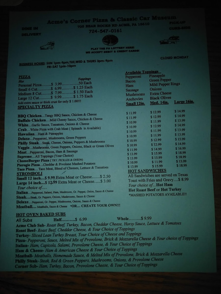 The menu at Acme Corner Pizza & Restaurant offers a straightforward selection of comforting, casual bites designed to satisfy all kinds of cravings. From classic cheese pizza to a variety of hearty sides like loaded fries, breaded mushrooms, and crispy onion rings, the options invite a relaxed dining experience that suits both quick lunches and leisurely dinners.